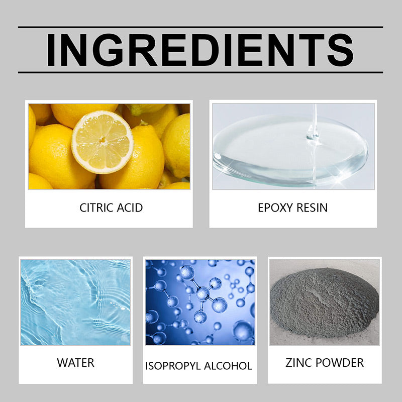 Ingrédients : eau, acide citrique, résine époxy, poudre de zinc, alcool isopropylique.