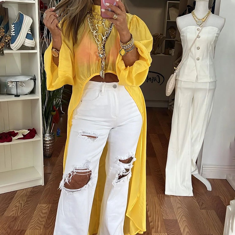 DESIGN ASYMĂTRIQUE UNIQUE - Silhouette moderne et avant-gardiste avec un devant plus court et un dos plus long pour un mouvement dynamique. Le tissu semi-transparent ajoute un aspect superposĂ© subtil, parfait pour ĂȘtre portĂ© sur des camisoles ou des bralettes pour une dĂ©claration chic et Ă la pointe de la mode.
