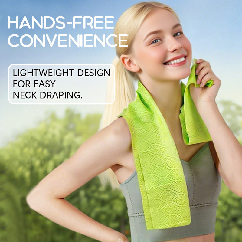CONFORT MAINS LIBRES - Légère et facile à suspendre, cette serviette s'enroule facilement autour du cou et assure un refroidissement continu sans glisser. Compacte et efficace, elle est la solution idéale pour lutter contre la fatigue due à la chaleur, où et quand vous en avez besoin.
