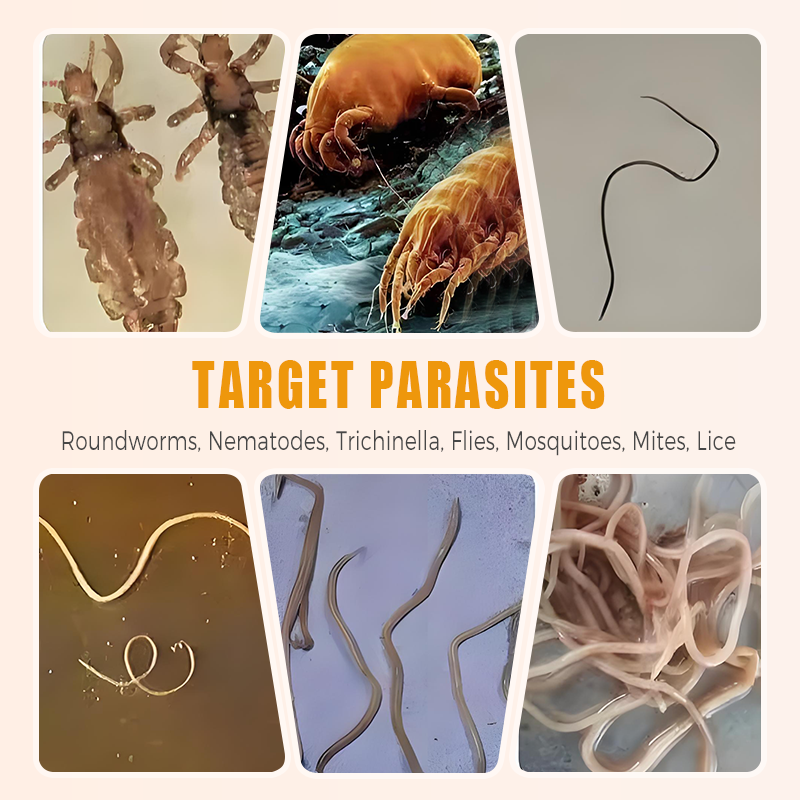 PROTECTION LARGE SPECTRE CONTRE LES PARASITES : Élimine efficacement les parasites internes (vers ronds, vers plats) et externes (moustiques, acariens, poux), garantissant la santé de votre élevage et des animaux exempts de parasites tout au long de l'année.